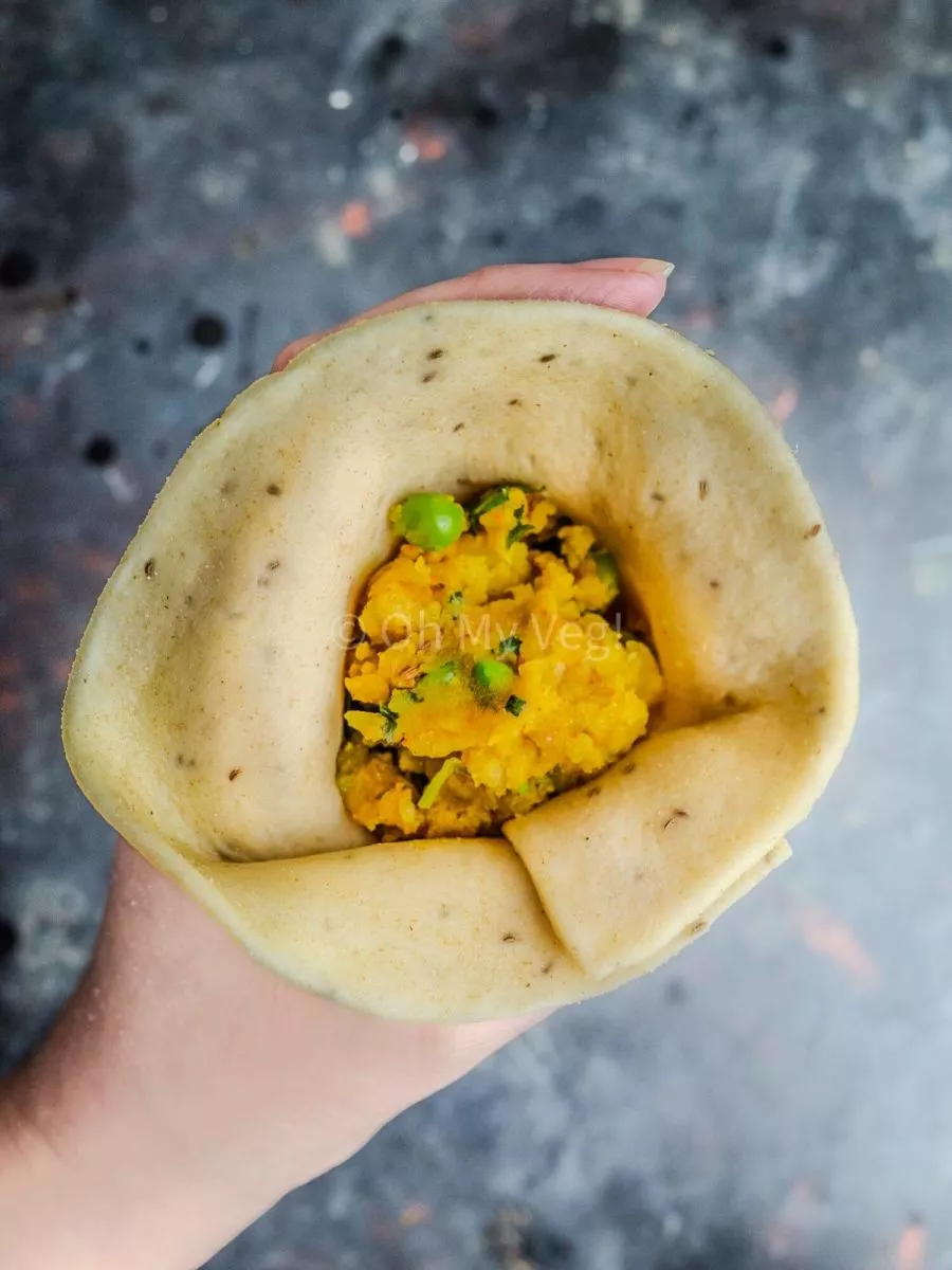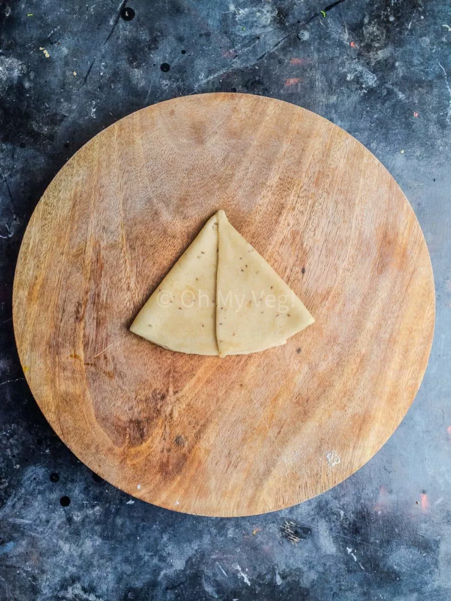 If you’re a beginner, folding Punjabi samosas can seem complicated, but it’s actually quite a simple process. Especially with homemade samosa pastry! Let’s dive into it, and if you struggle to visualize the process, refer to the pictures above to help.