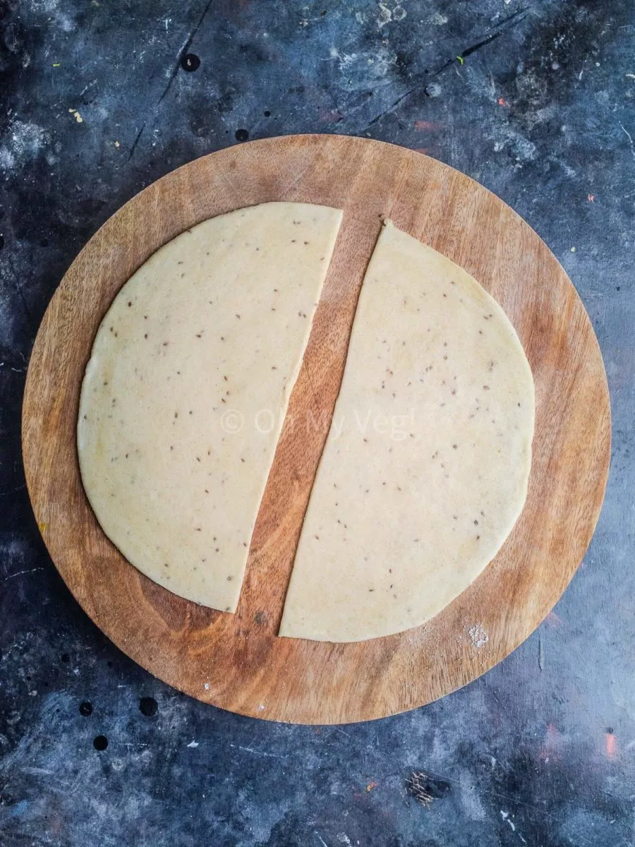 - Divide your samosa dough into four pieces. Roll each of them between your palms to make smooth balls. Take one dough ball, dust it in extra roll, and roll it out into an eight-inch circle. Cut the circle in half.